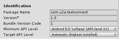 裡面比較重要的是packgeName ,unity BuildSetting內的packgeName要跟AndroidManifest內的packgeName一樣,minSdkVersion 也必須跟BuildSetting內MinimumAPI Level一樣 (見下圖)